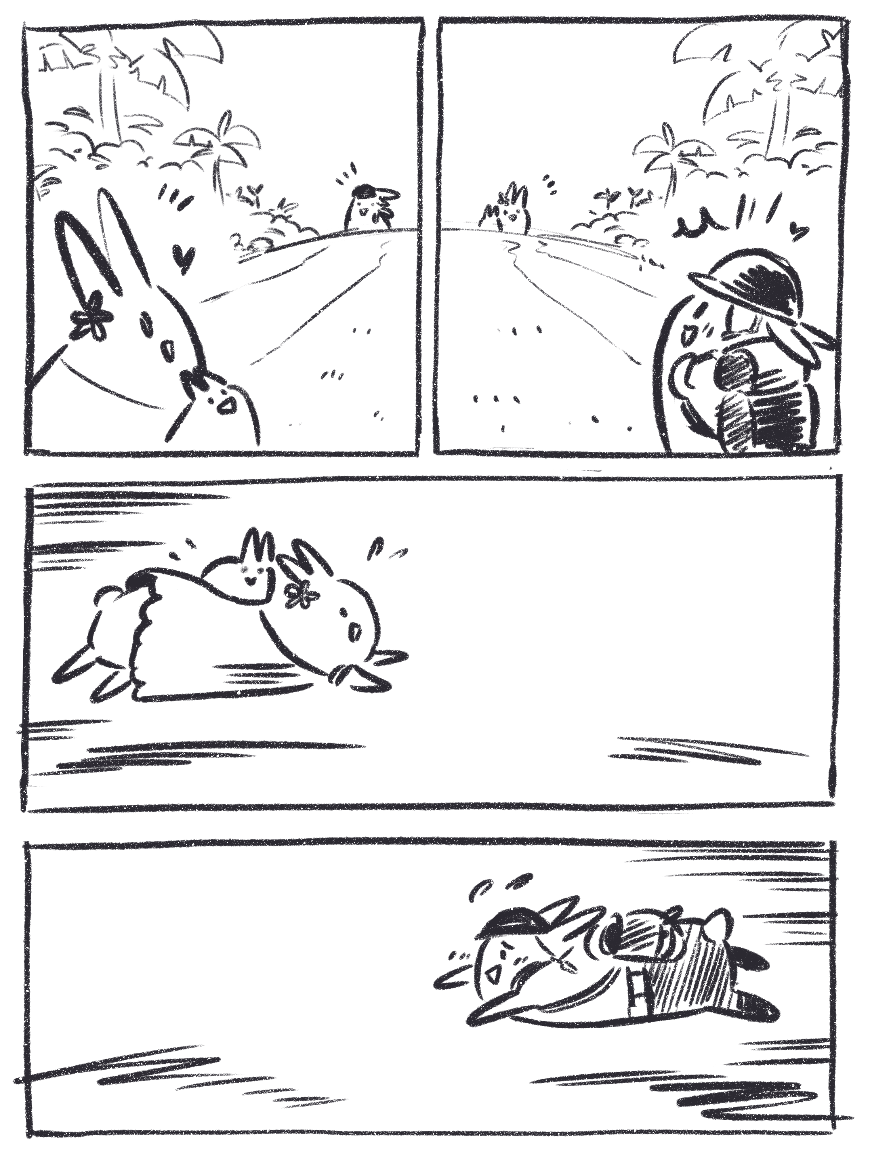 Backstory: Before leaving for the battle, my lolo (grandfather) asked my lola (grandmother) to meet him at the park outside of the US Army station in Manila. Even though she knew he might never come back, she visited and waited at the park everyday for his return, even having baby during the wait. Story all told through rabbits.